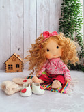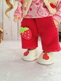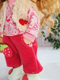 لباس های عروسک شامل تیشرت که از پشت دکمه داره ، شلوار که مرش کش داره با استیکر گلدوزی توتفرنگی، تل پارچه ای ، و جلیقه پشمالو ، جوراب ، کفش و تل کشی این عروسک با بسته بندی شیک براتون ارسال میشه و مناسب هدیه دادنه