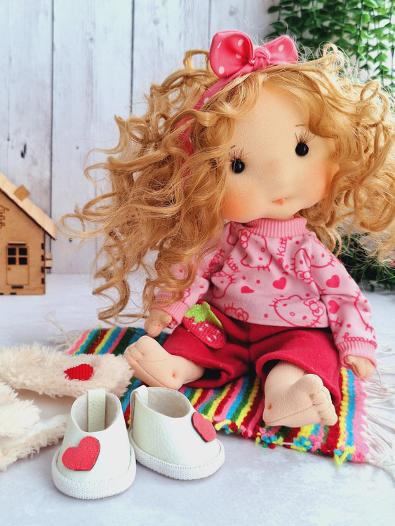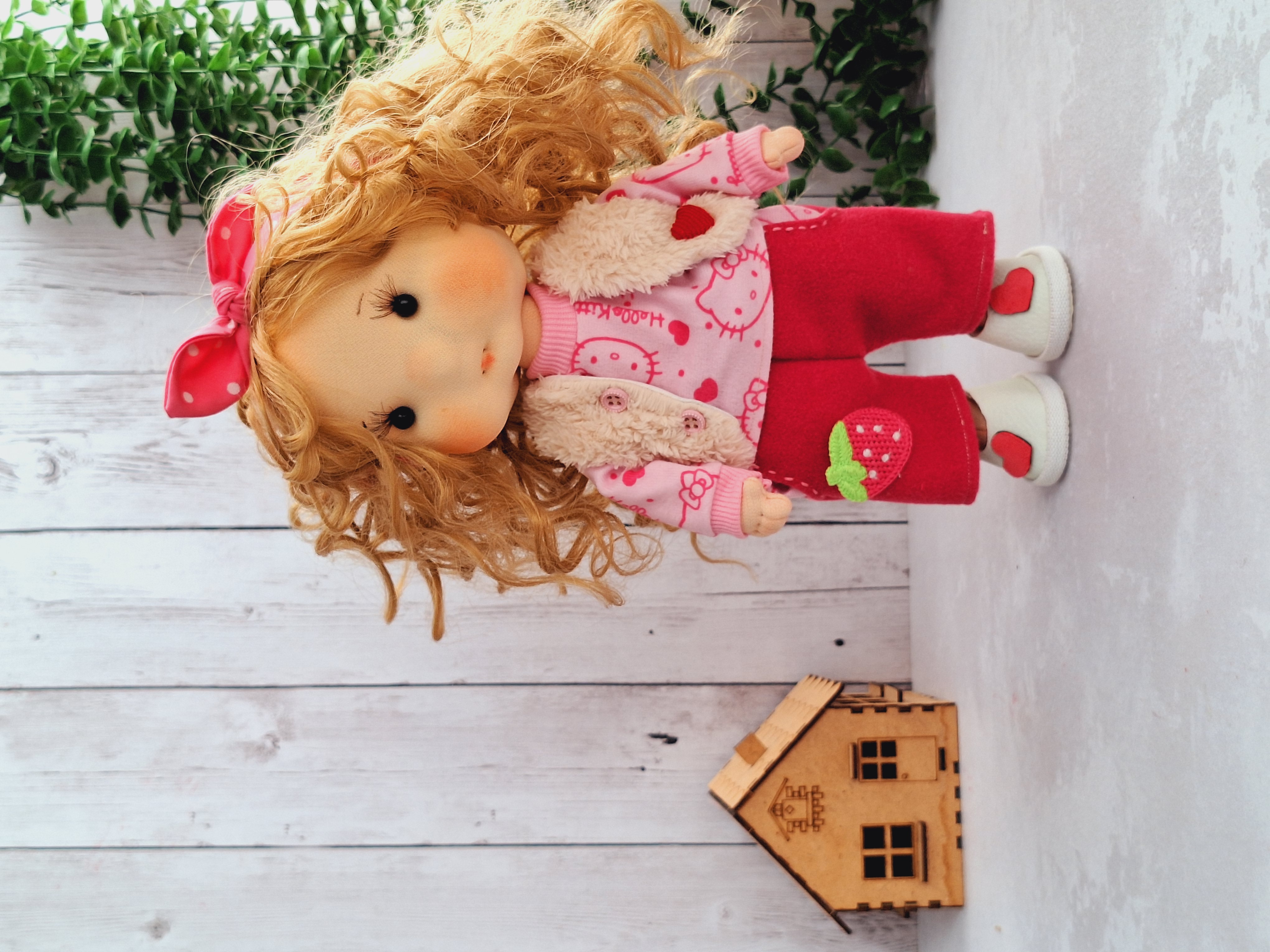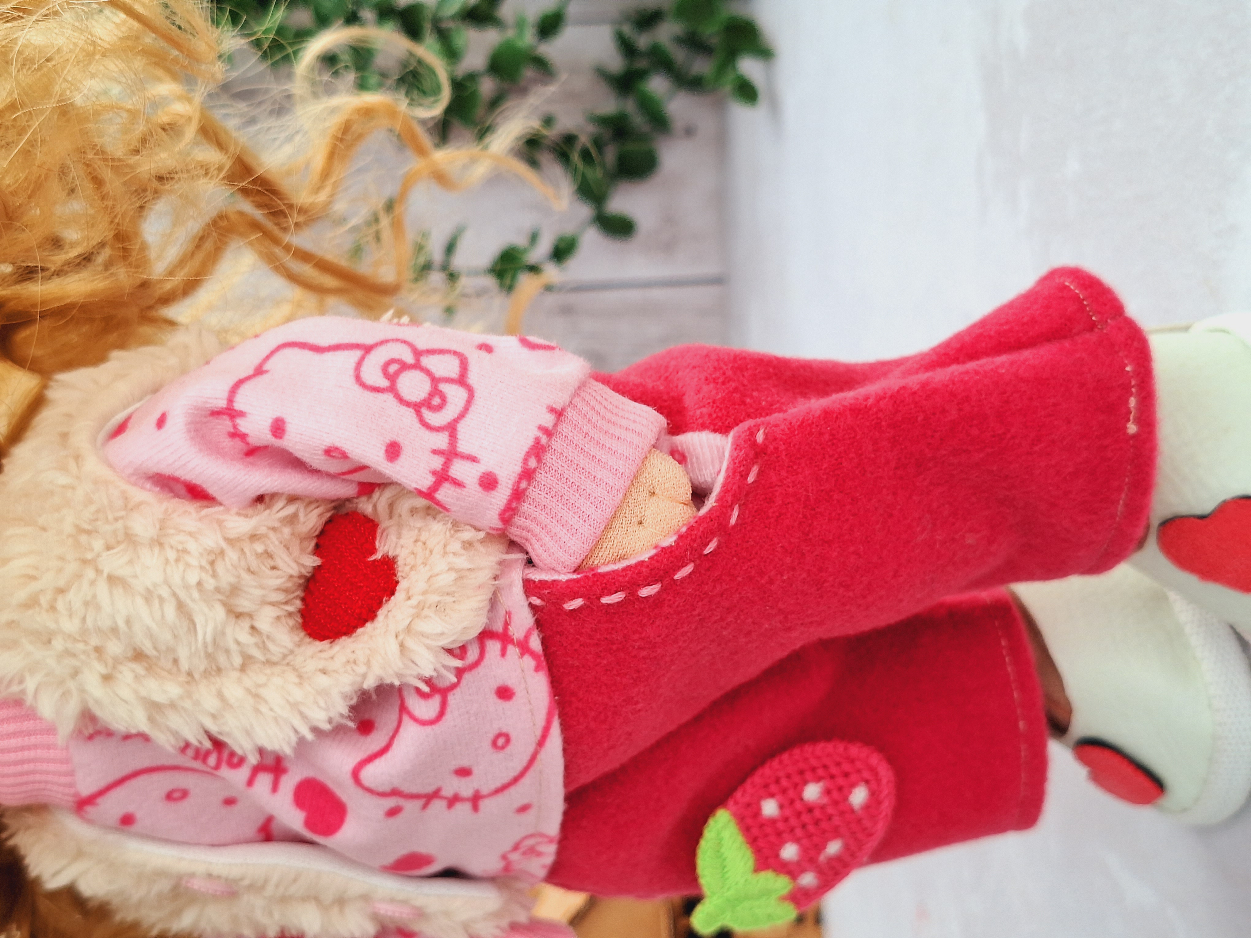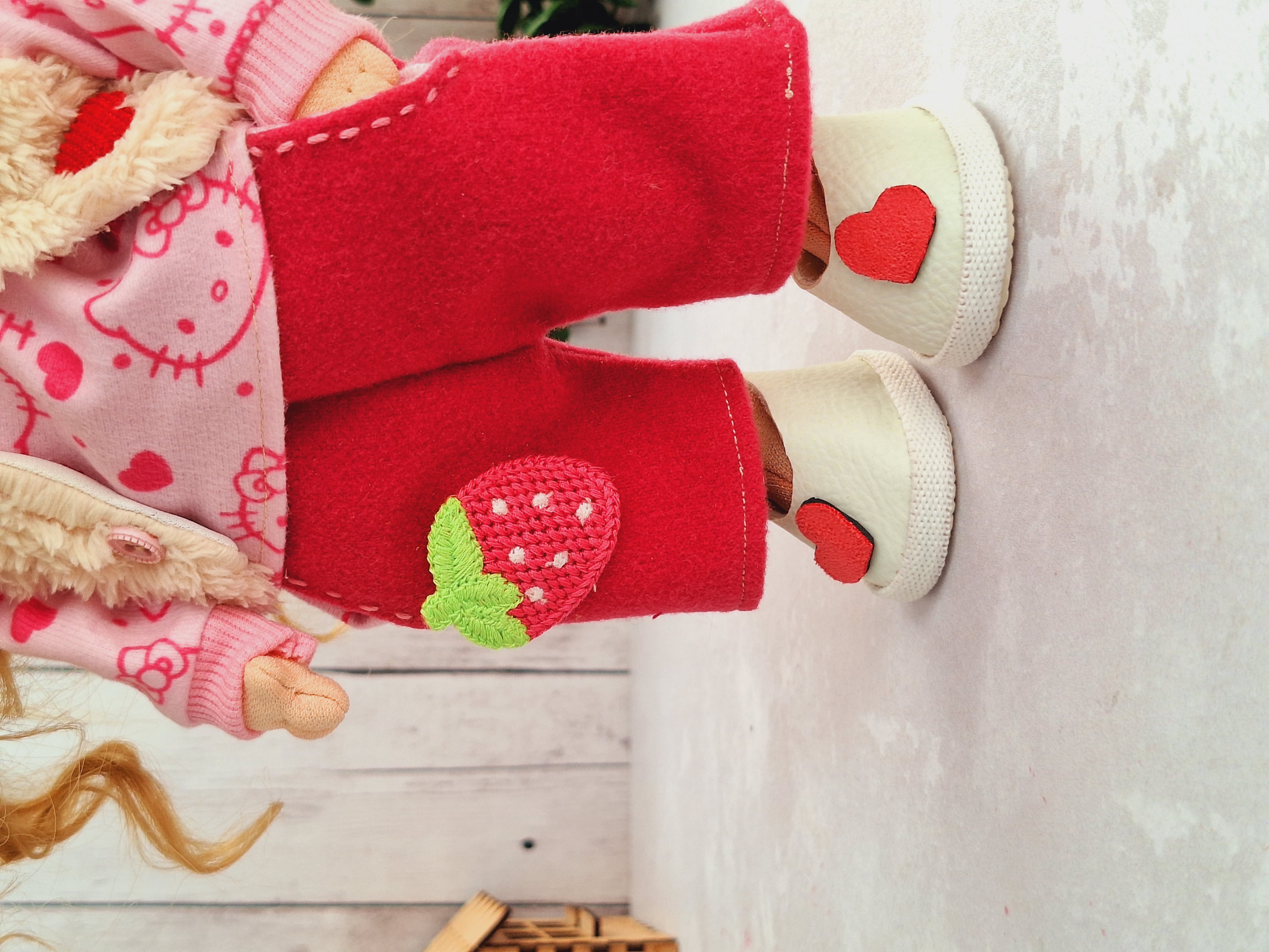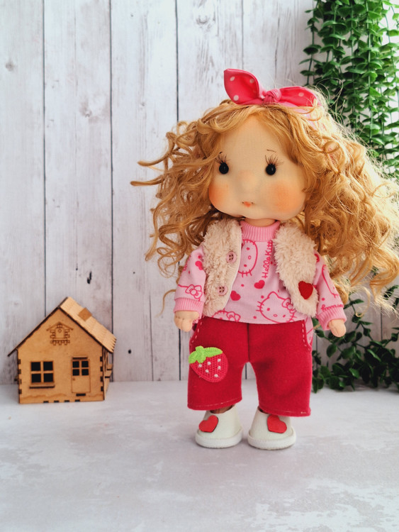 لباس های عروسک شامل تیشرت که از پشت دکمه داره ، شلوار که مرش کش داره با استیکر گلدوزی توتفرنگی، تل پارچه ای ، و جلیقه پشمالو ، جوراب ، کفش و تل کشی این عروسک با بسته بندی شیک براتون ارسال میشه و مناسب هدیه دادنه