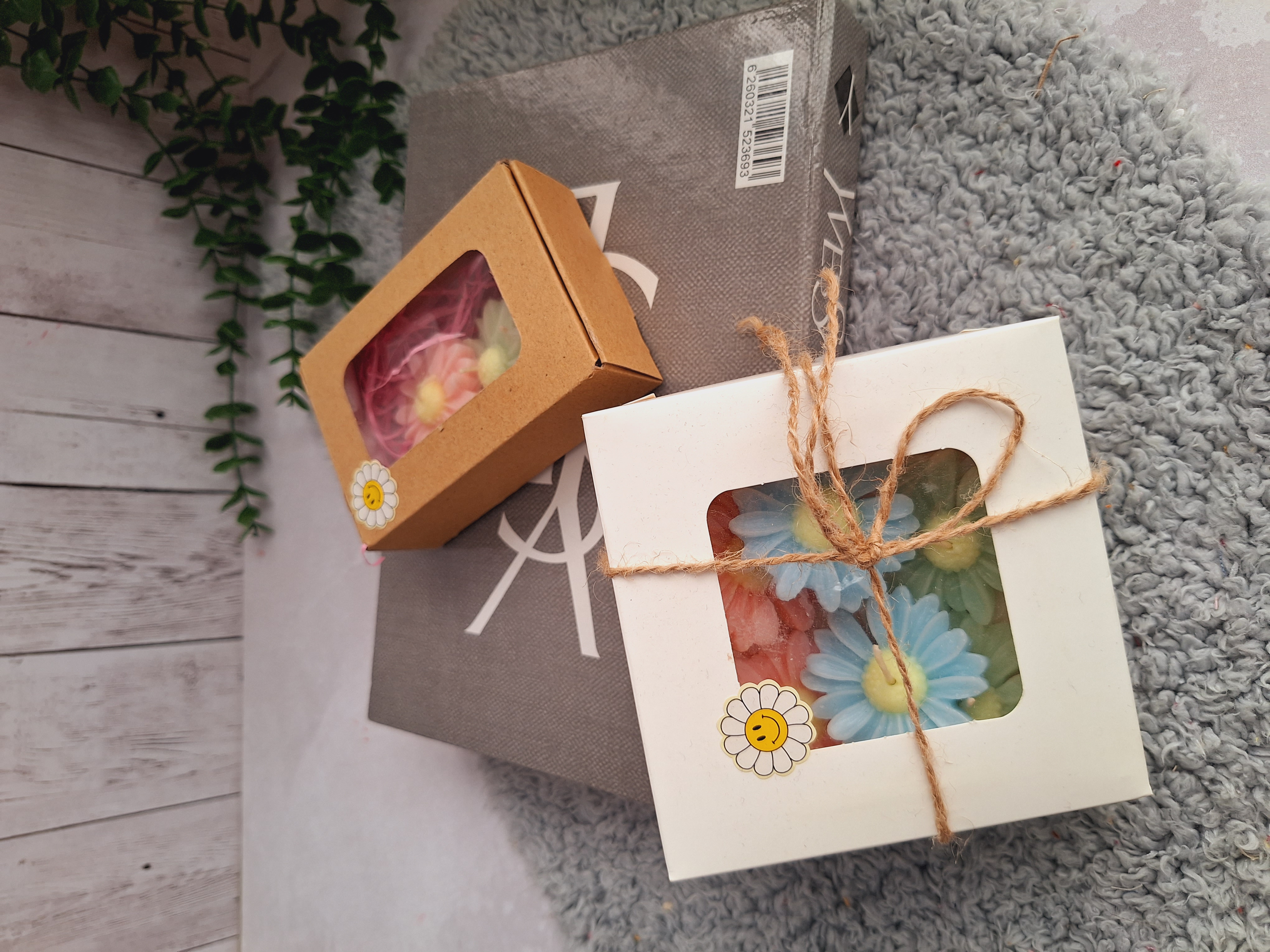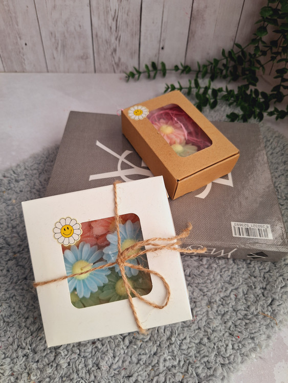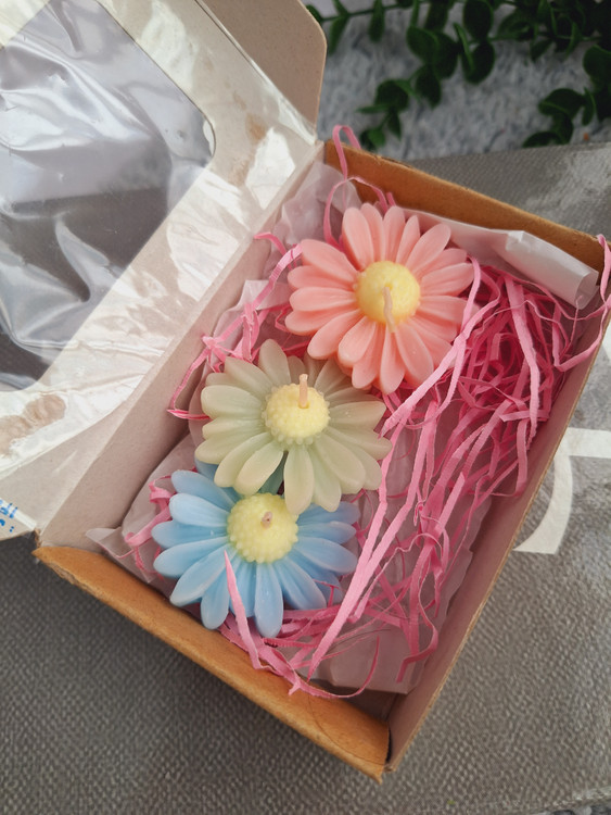 داخل هر پک شمع بابونه با رنگ های صورتی و آبی و سبز موجوده